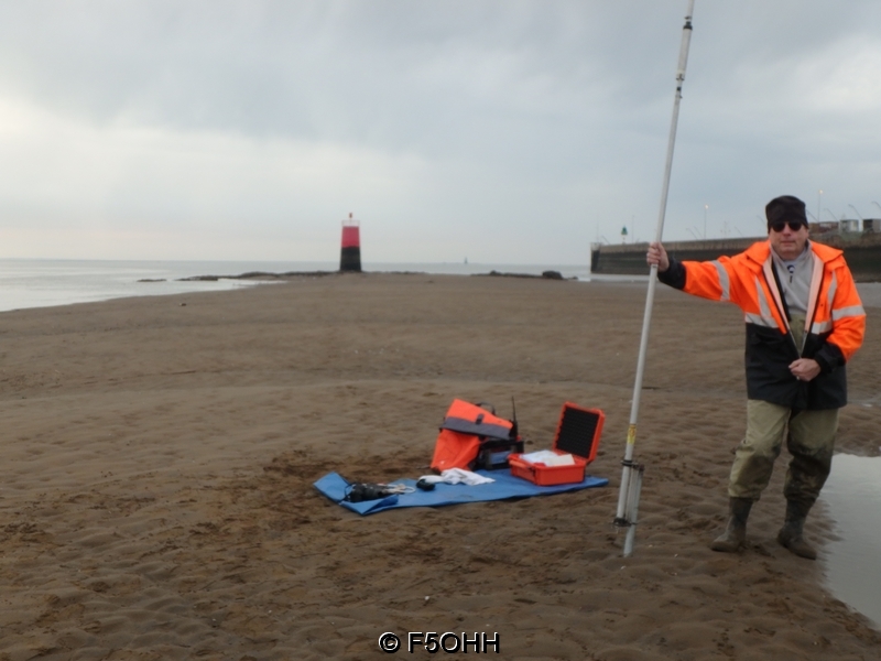Pour revenir à la l’antenne verticale en général je l’assemble avant de partir. Je porte des waders qui remontent sous les bras afin de me protéger, du froid et du vent ainsi que de la vase nauséabonde des lieux. En revanche comme l’ensemble est étanche un certain moment il fait chaud.